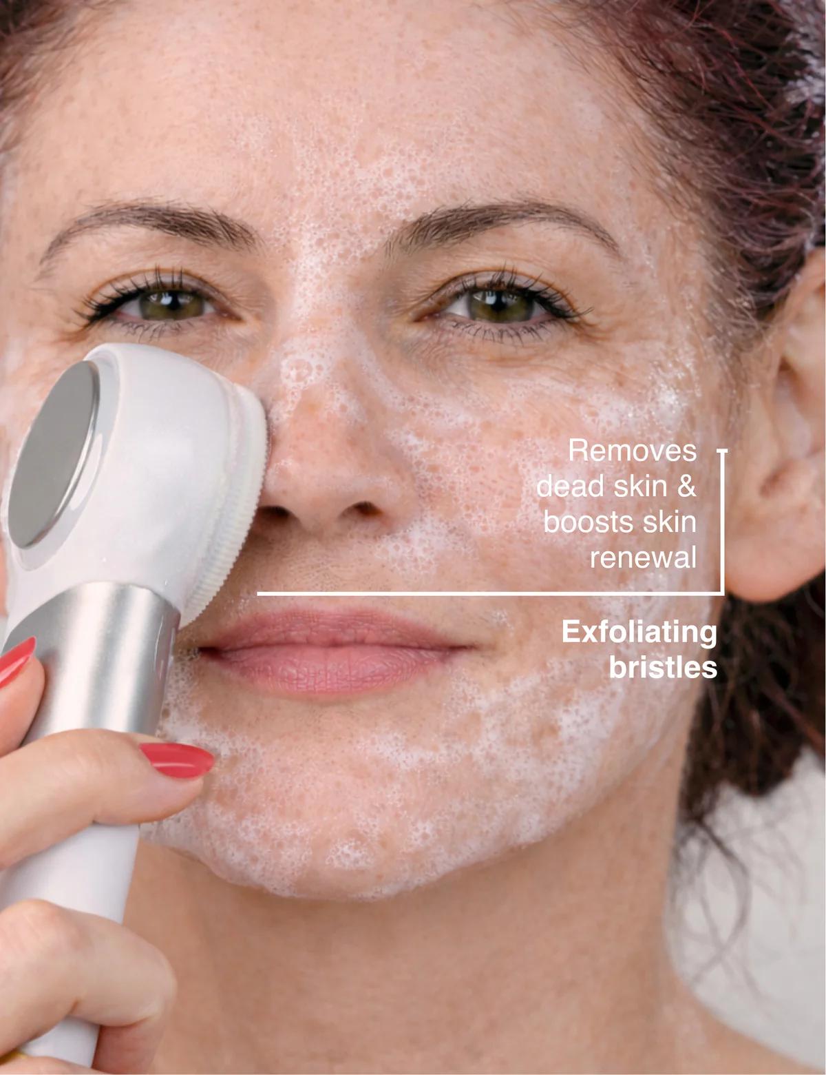 Step 1: Cleanse your face using the brush with your favorite cleanser (2–3× per week), then gently pat your skin dry.